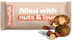 Bio-Haselnuss-Snackkugeln mit Haselnuss-Cashewkerne Füllung (2x17). Zutaten: Dattel*, Hafermehl* (glutenfrei), geröstete Haselnuss (14%)*, geröstete Cashewkerne (10%)*, Haselnussmus (5,6%)*, Dattelsirup* (Dattel, Wasser), Cashewmus(3,6%)*, Kakao Butter*, Salz, Vanille*. Kann Spuren von Gluten, Eiern, Milch, Schalenfrüchten, Sulfiten, Sesam und/oder daraus hergestellten Produkten enthalten.