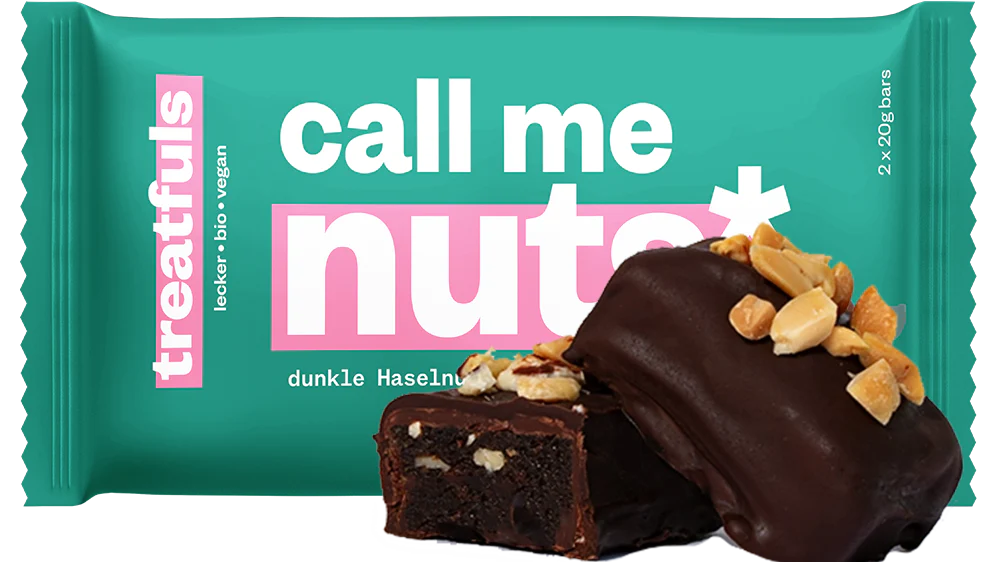 Bio-Haselnuss-Cashewkerne-Riegel mit dunkler Schokoladen-Kuvertüre (mit einem Kakaoanteil von mindestens 75%). mit Süßungsmittel. (2 x 20g). ZUTATEN: Dattel*, HASELNUSS* (18%), Hafermehl (glutenfrei), dunkle Schokoladenkuvertüre* (9%) [Kakaobutter*,**, Süßungsmittel: Erythrit*, Kakaobutter*,**], geröstete CASHEWKERNE* (8%), Mandel*, Kakao gemahlen*,**, Meersalz, Vanille*.