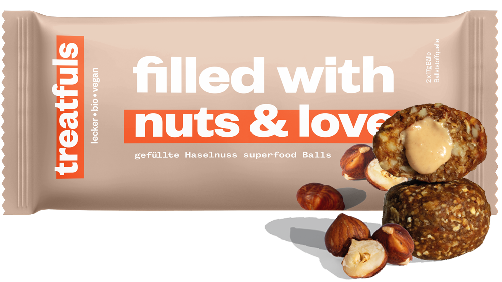 - 7x "Filled with Nuts and Love"(2x17g): Eine nussige Verführung, die an Giotto erinnert, aber in einer gesünderen, liebevoll kreierten Version mit Haselnuss- und Cashewmus-Füllung.