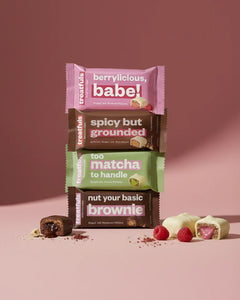 Zutaten: Dattelpaste, dunkle Schokoladenkuvertüre (15%) (Kakaomasse, Haferdrink, Kakaobutter), Haselnuss-Füllung (15%) [Haselnussmus (42%), Dattelpulver, Cashewmus, Kakaobutter], Dattelsirup, glutenfreies Hafermehl, Haselnuss (6,4%), Cashewkerne, Tapiokafaser, Mandeln, Kakaopulver, Meersalz, Vanilleextrakt. Kann Spuren von Gluten, Eiern, Milch, Schalenfrüchten, Sulfiten, Sesam und/oder daraus hergestellten Produkten enthalten. Trocken lagern und vor Wärme schützen.