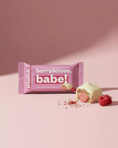 Deutsch: Dattelpaste, weißer Kakaobutterhaltiger Überzug (15%) (Kakaobutter, Reisdrinkpulver, Kokosnusspulver, Süßungsmittel: Erythrit, Orangenpulver), Macadamia-Cashew-Himbeerfüllung (16%) (Cashewmus (64%), Dattelpulver, Kokosnussmilchpulver, Macadamiamus, gefriergetrocknete Himbeeren), glutenfreies Hafermehl, Mandeln (11,2%), Dattelsirup, Tapiokafaser, Mandelmus (3,8%), Meersalz, Vanilleextrakt. Kann Spuren von Gluten, Eiern, Milch, Schalenfrüchten, Sulfiten, Sesam und/oder daraus hergestellten Produkten enthalten. Trocken lagern und vor Wärme schützen.