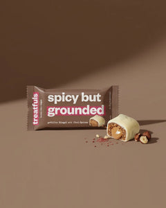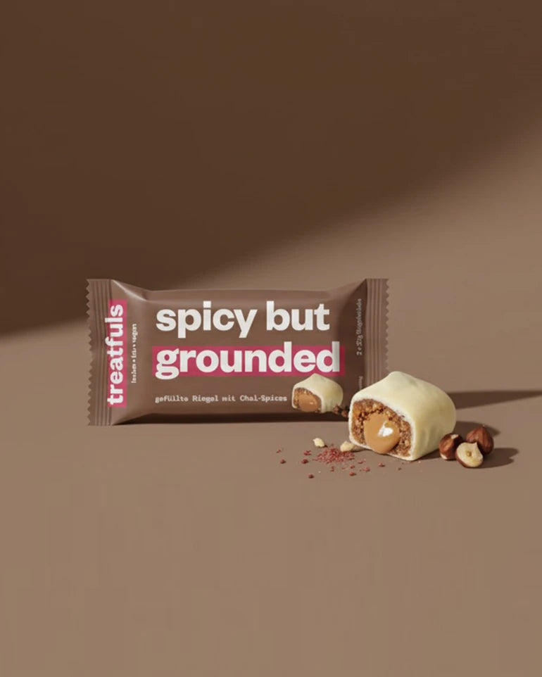 Dattelpaste, weißer kakaobutterhaltiger Überzug (15%) (Kakaobutter, Reisdrinkpulver, Kokosnusspulver, Süßungsmittel: Erythrit, Orangenpulver), Haselnuss-Füllung (15%) (Haselnuss (42%), Dattelpulver, Cashewmus, Kakaobutter), glutenfreies Hafermehl, Haselnuss (8,4%), Dattelsirup, Mandelmus, Tapiokafaser, Chai-Gewürzmischung (1,45%) (Zimt, Ingwerpulver, Kardamom, Muskatnuss, Nelkenpulver, Korianderpulver, Piment), Kakaobutter, Meersalz, Vanilleextrakt.
