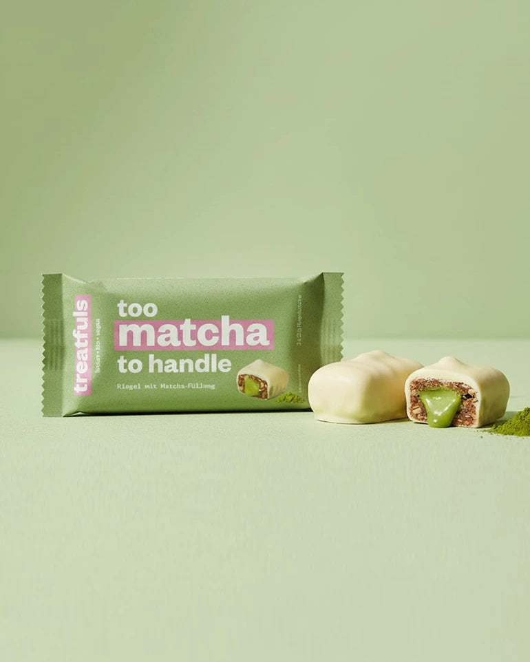 Dattelpaste, weißer Kakaobutterhaltiger Überzug (15%) (Kakaobutter, Reisdrinkpulver, Kokosnusspulver, Süßungsmittel: Erythrit, Orangenpulver) , Cashew-Matcha-Füllung (15%) [Cashewmus (60%), Dattelpulver, Kokosnussmilchpulver, Macadamiamus, Matchapulver (3%)], glutenfreies Hafermehl, Mandeln, Dattelsirup, Tapiokafaser, Mandelmus, Meersalz, Vanilleextrakt.
